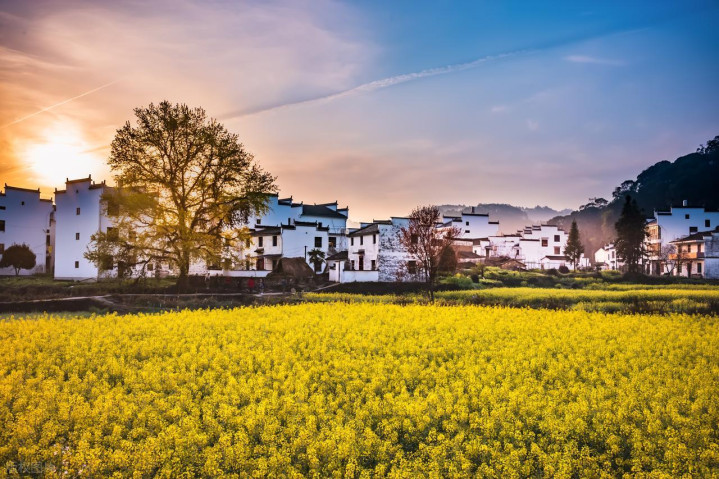 灰瓦白墙,活水东说念主家,还有春天漫天匝地的金黄,这即是婺源。春季的婺源是最好意思的,当你踏进于一派金色的海洋中,你的眼睛所到之处,你的鼻子所闻的气息,王人是油菜花。太阳起飞,褭褭炊烟,狗吠,还有那村民的叫喊声,说不出的静谧和舒缓。