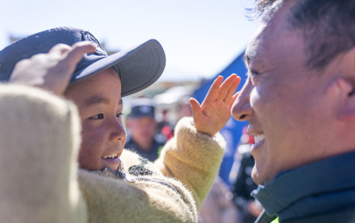 2025年1月14日,在西藏定日县长所乡嘎布村,又名小一又友戴上外侨警员米玛次仁的帽子敬礼。新华社记者 丁增尼达 摄